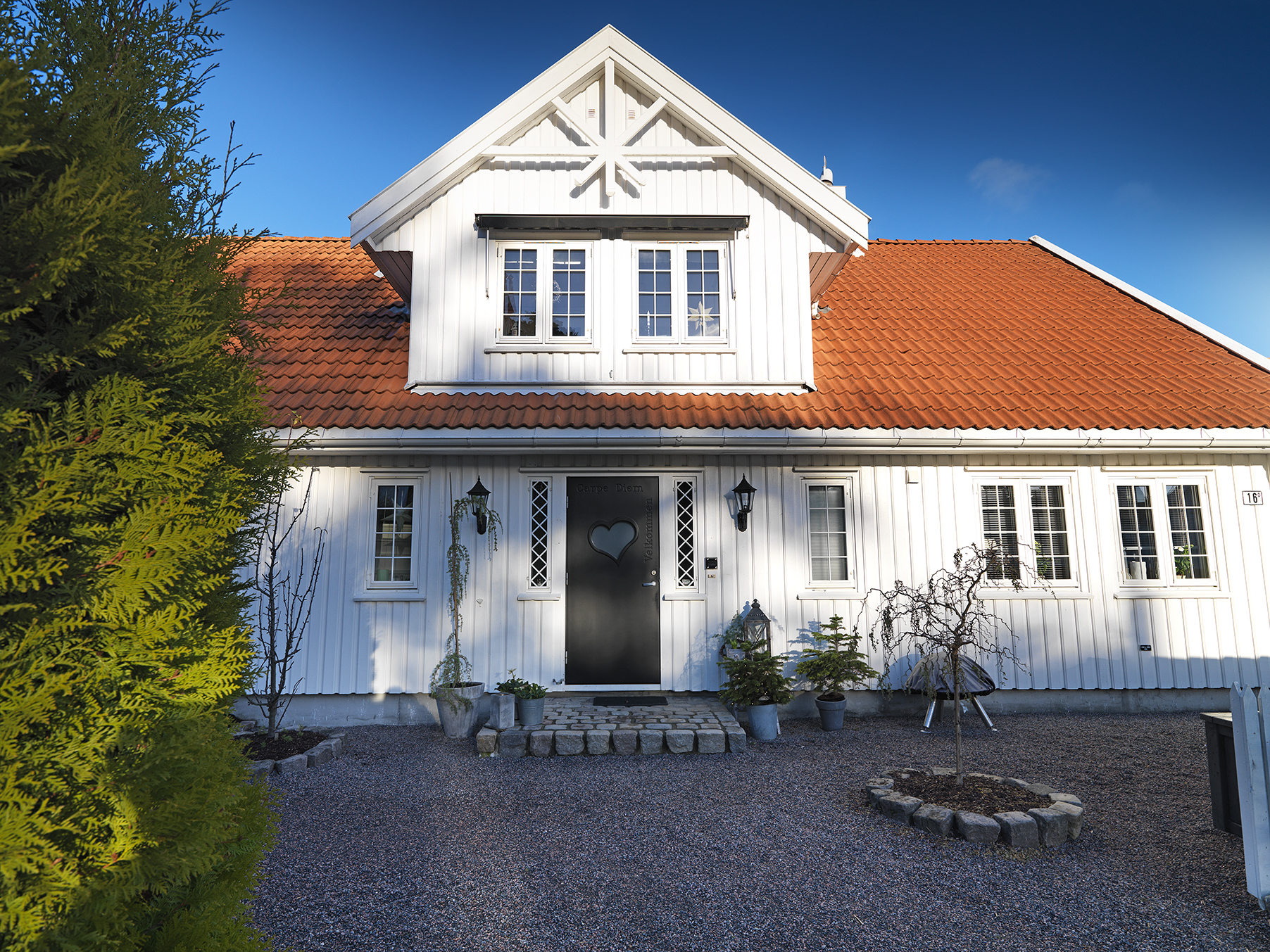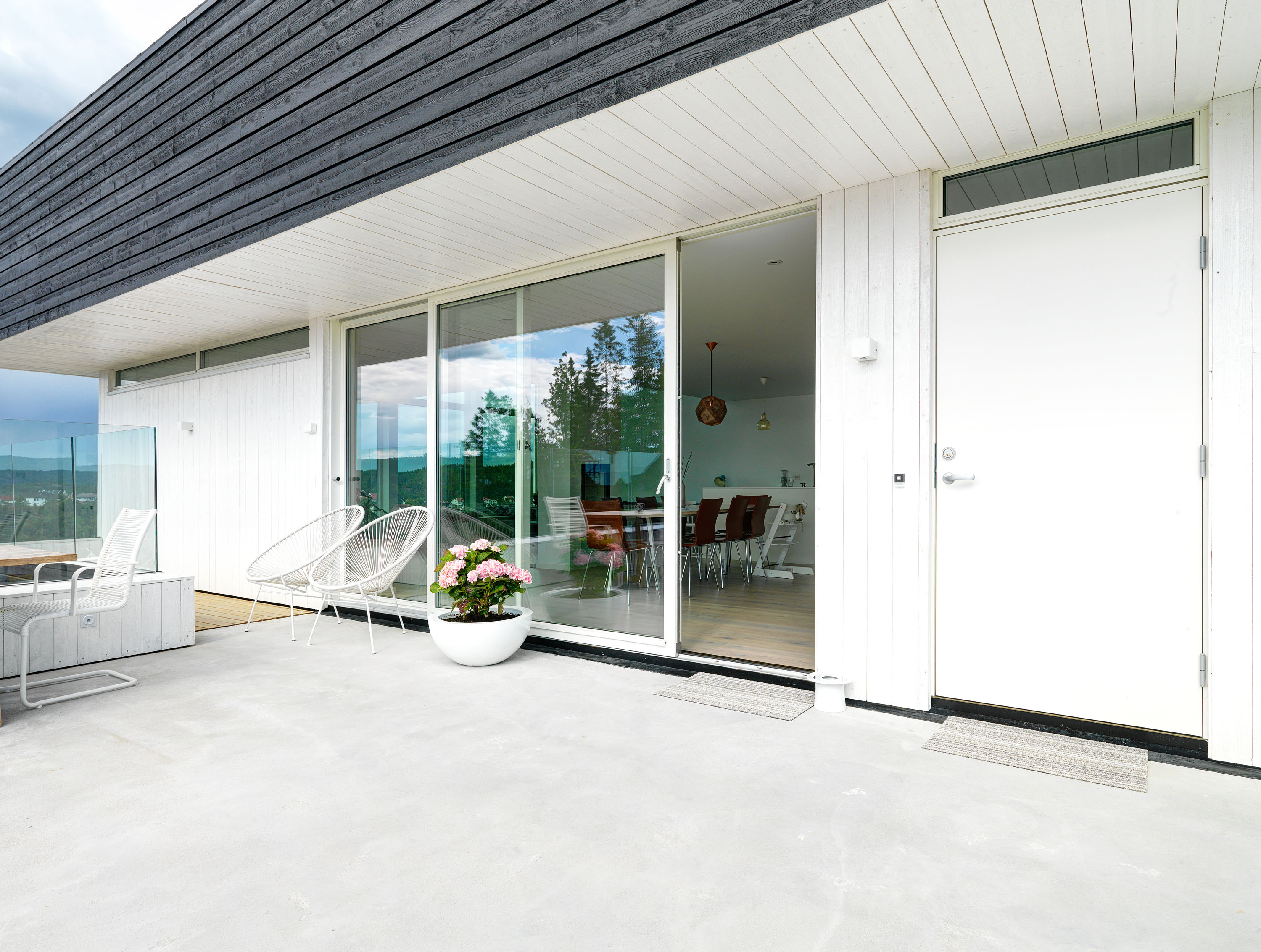 I dette huset i Kristiansand har de valgt døren Afrodite. Et spennende valg på et sørlandshus.