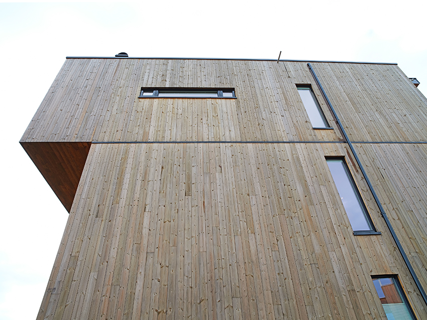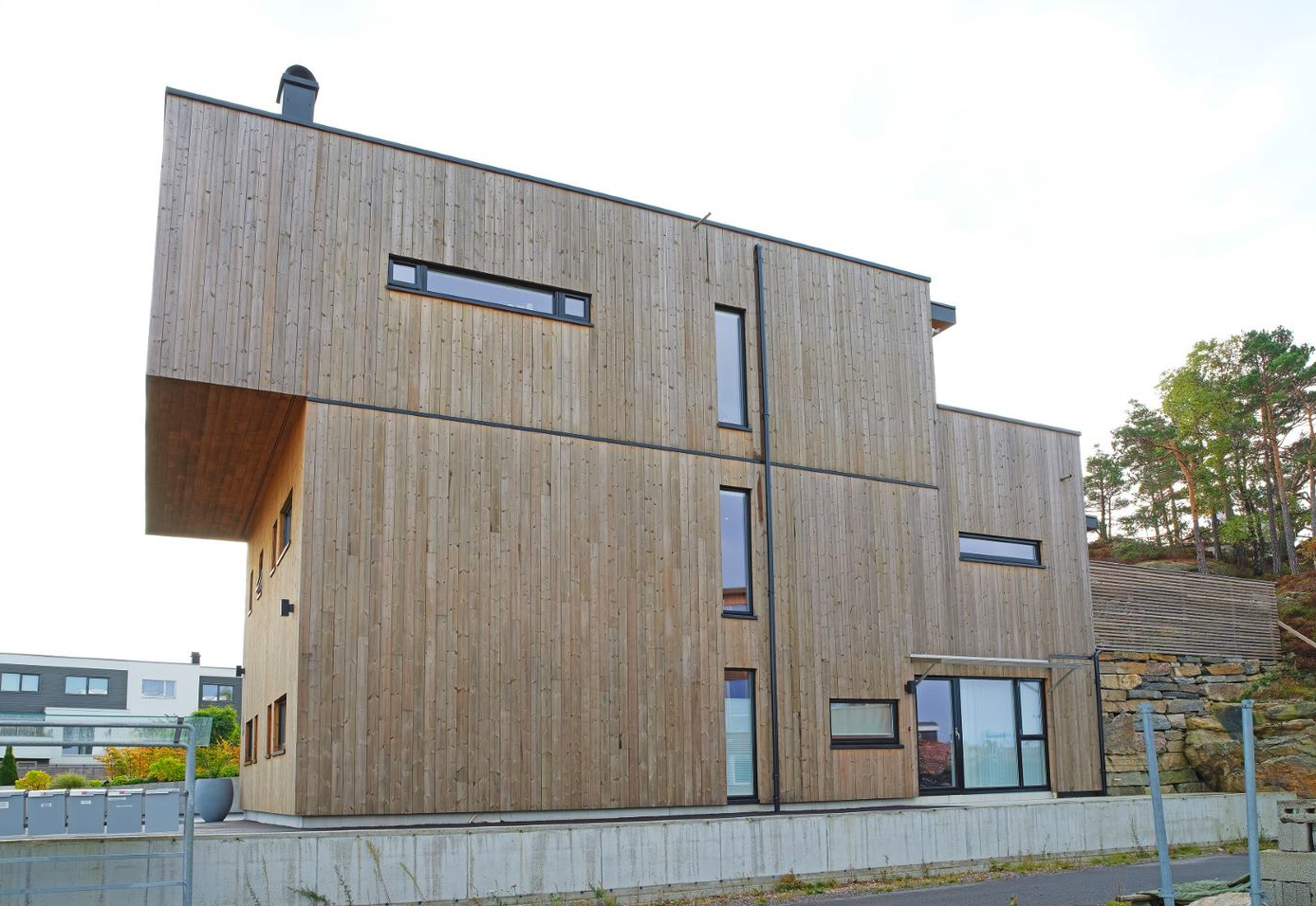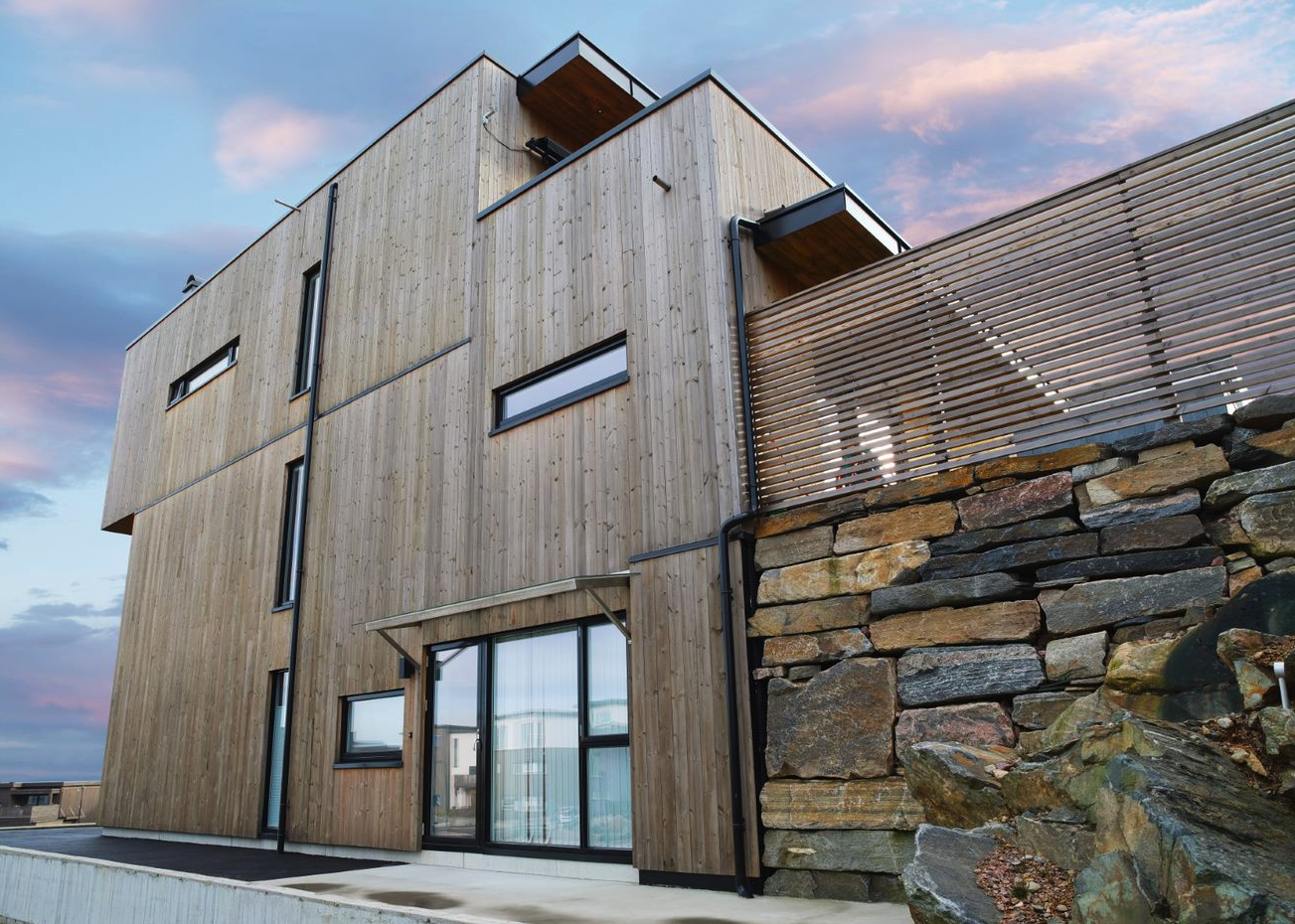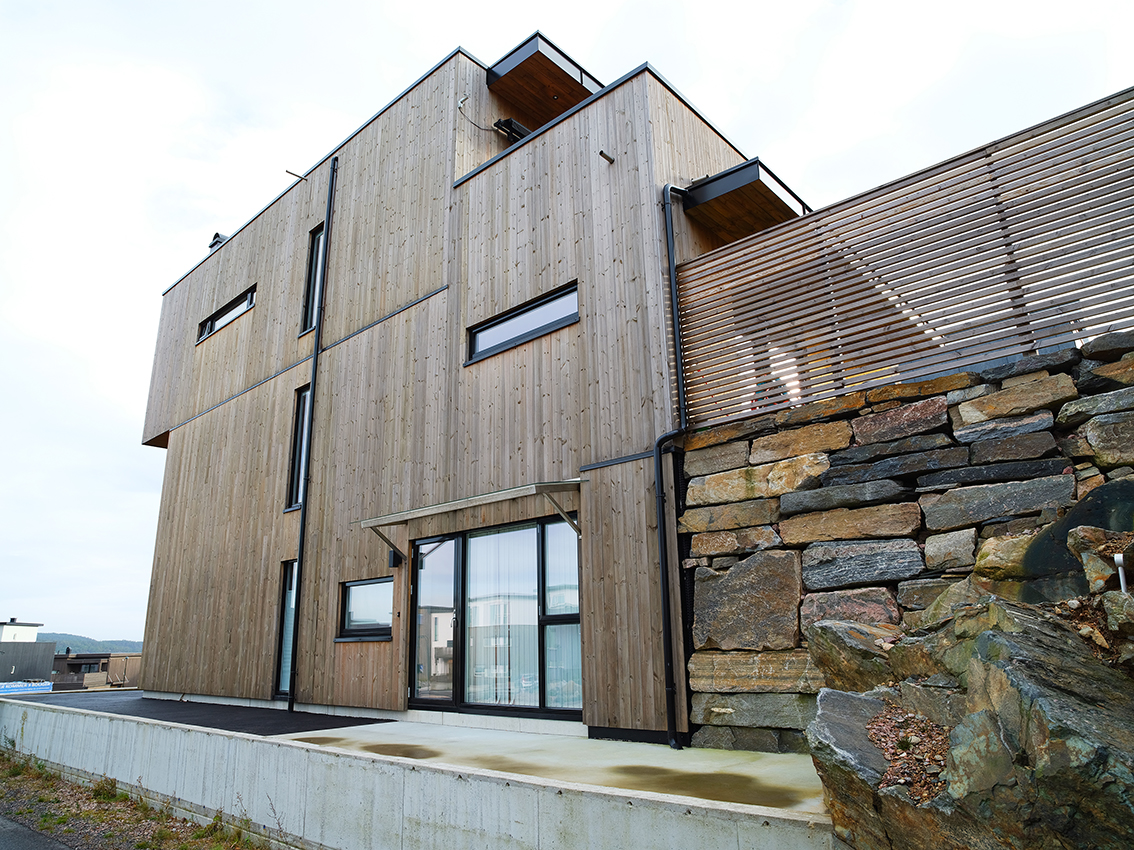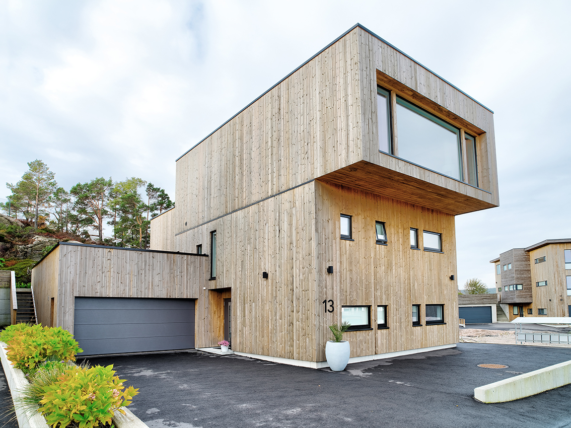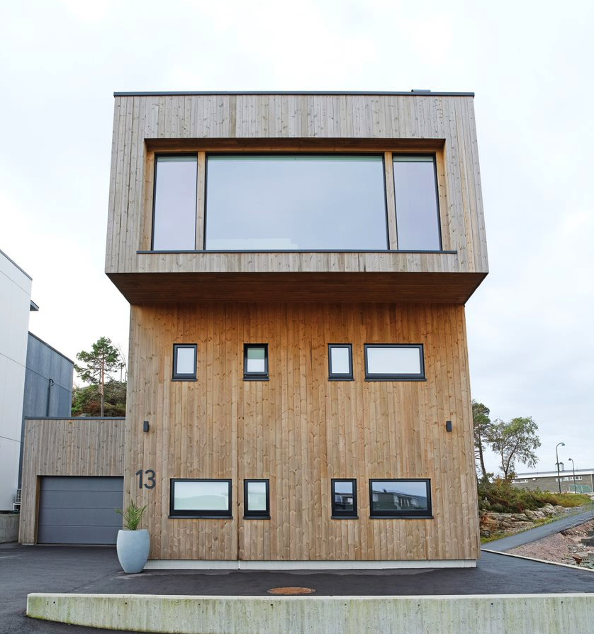 Kombinasjon av store og små vindusflater skaper et spennende arkitektonisk uttrykk på denne eneboligen i Kristiansand. Å velge selvvaskende vinduer var et ganske enkelt valg for huseier.