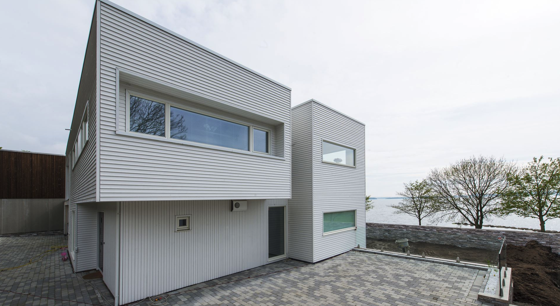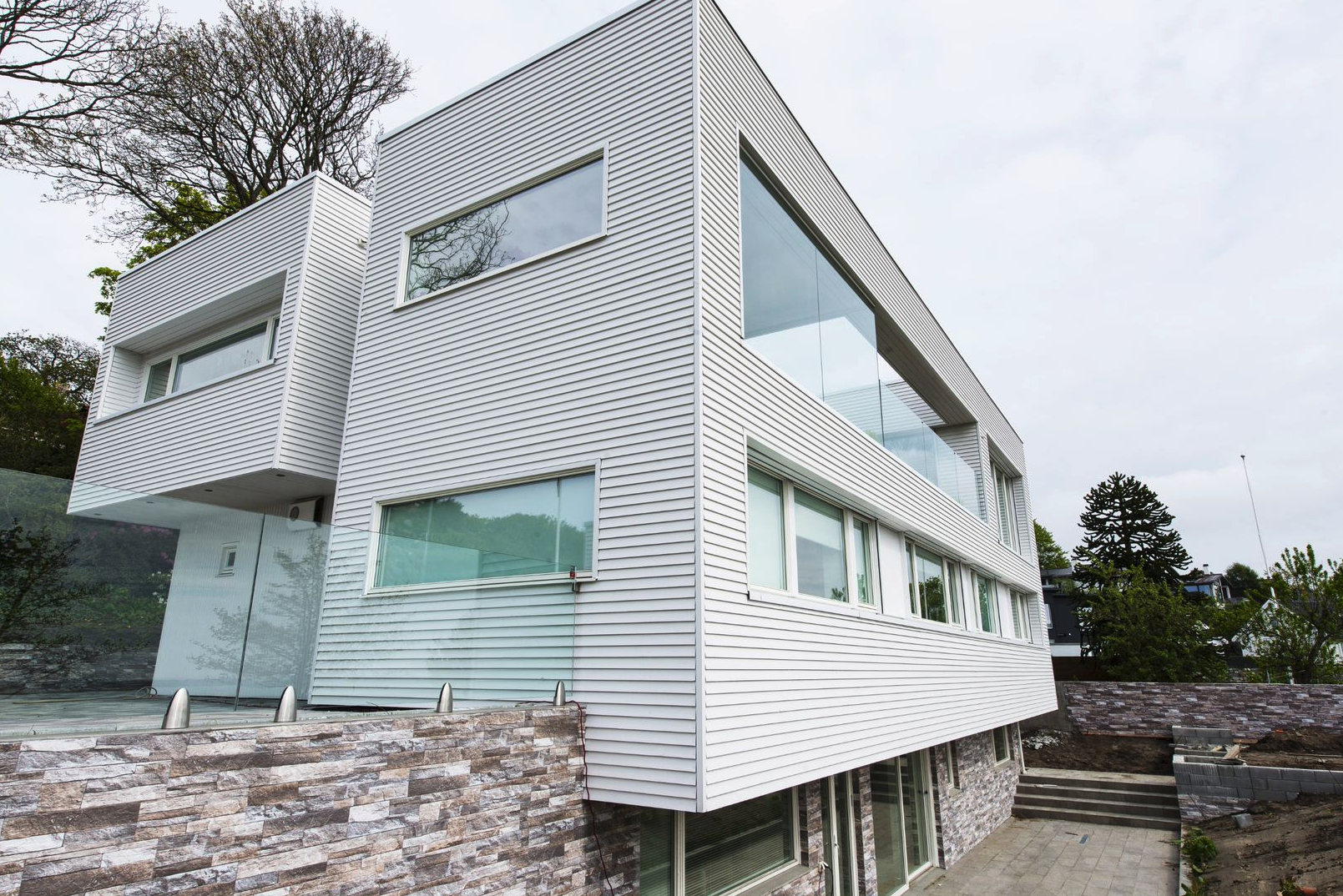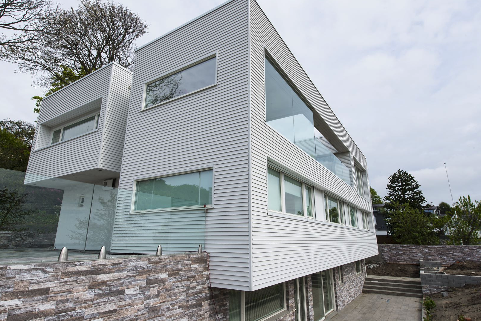 Huset uten for Stavanger ligger tett på en av de store innfartsveiene, og på motsatt side av veien ligger havet. Med lyddempende vinduer kan havutsikten nytes uten skjenerende trafikkstøy.