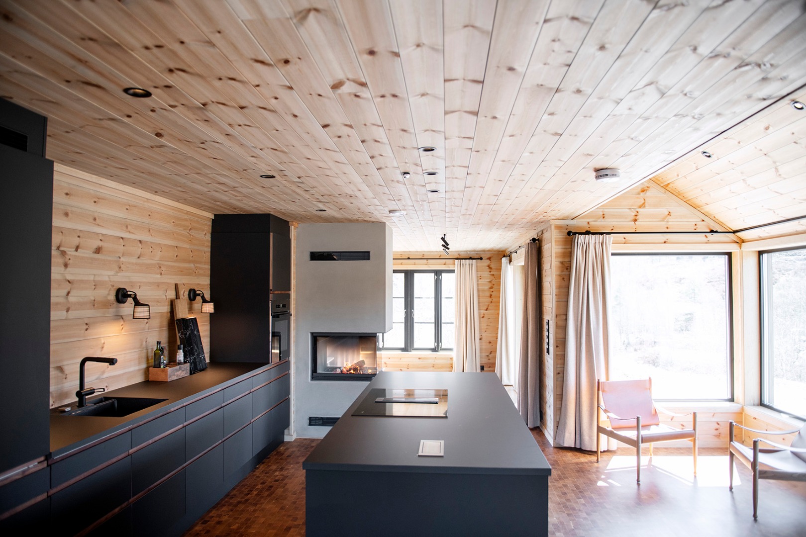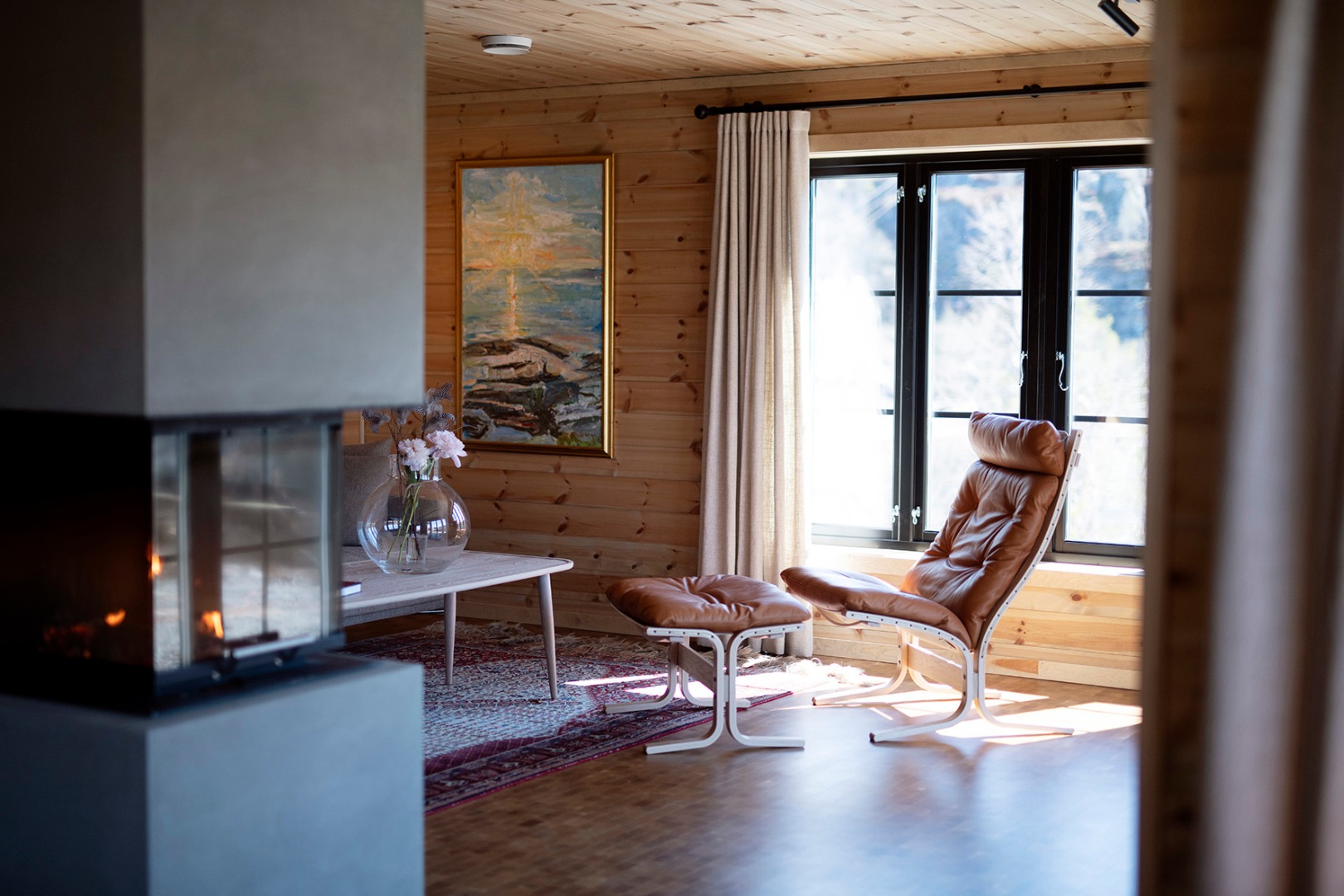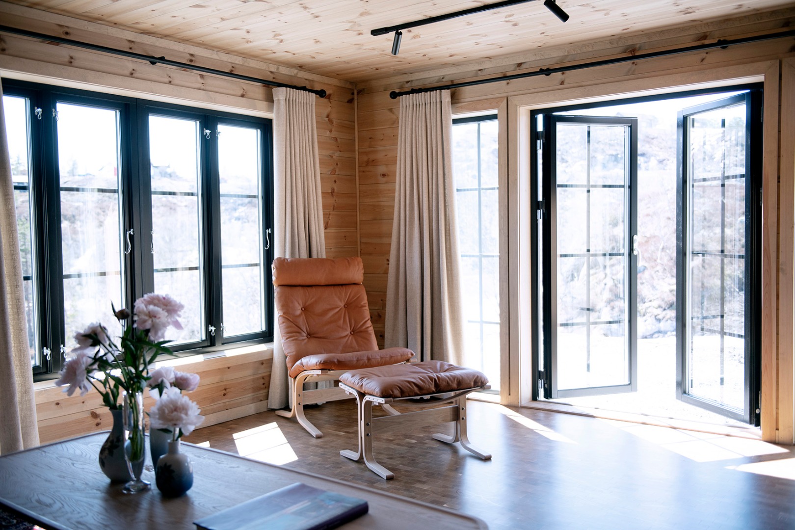 Dette er en stor og romslig familiehytte. Her har vi levert sidehengslede vinduer og dører fra produktserien Gilje Basic. Vinduene har 25mm klipssprosse i aluminium utvendig. Klipssprossen er enkel å ta av og sette på igjen når du vasker vinduene. Vinduene er malt i sort NCS S 9000N.