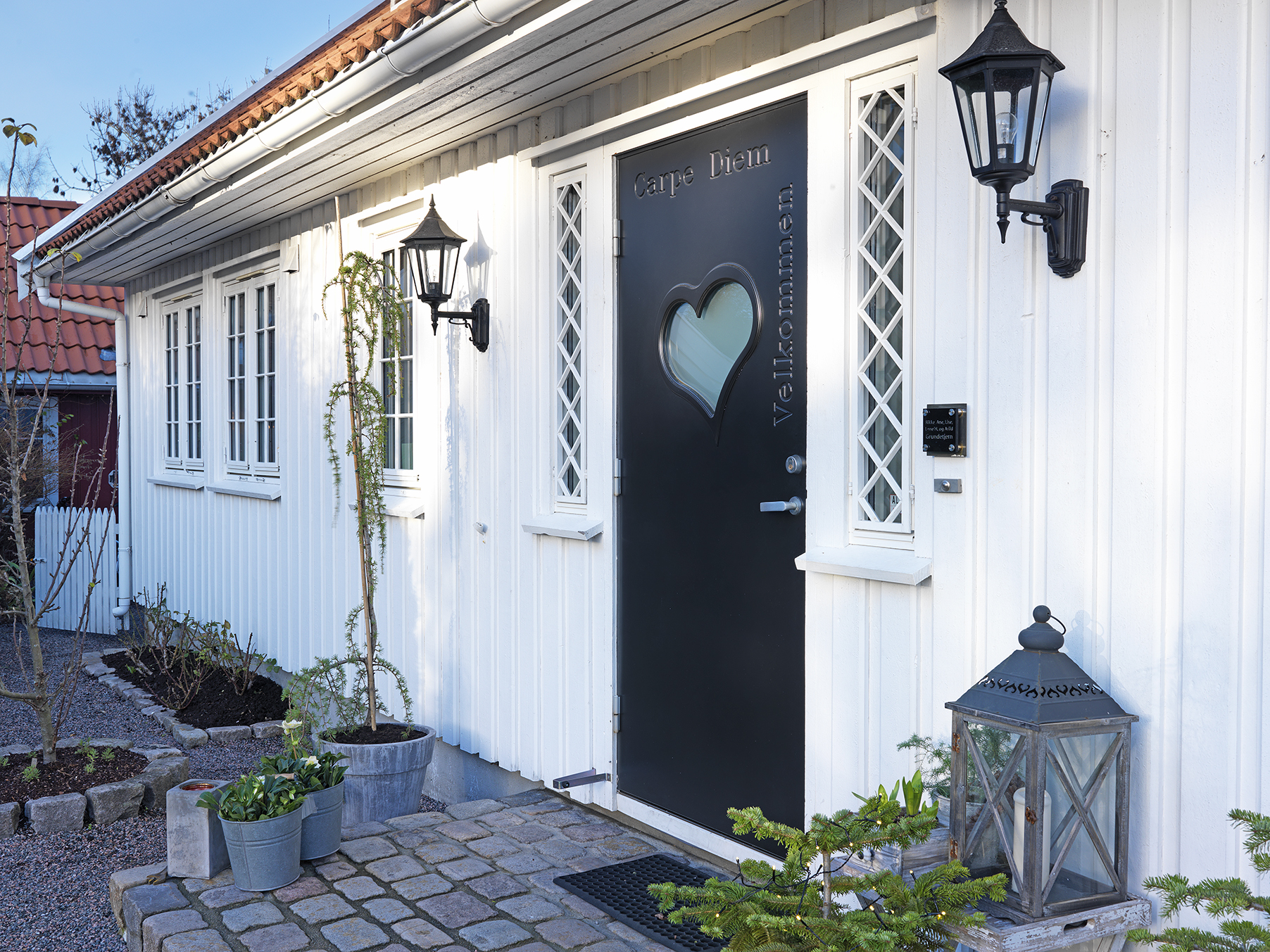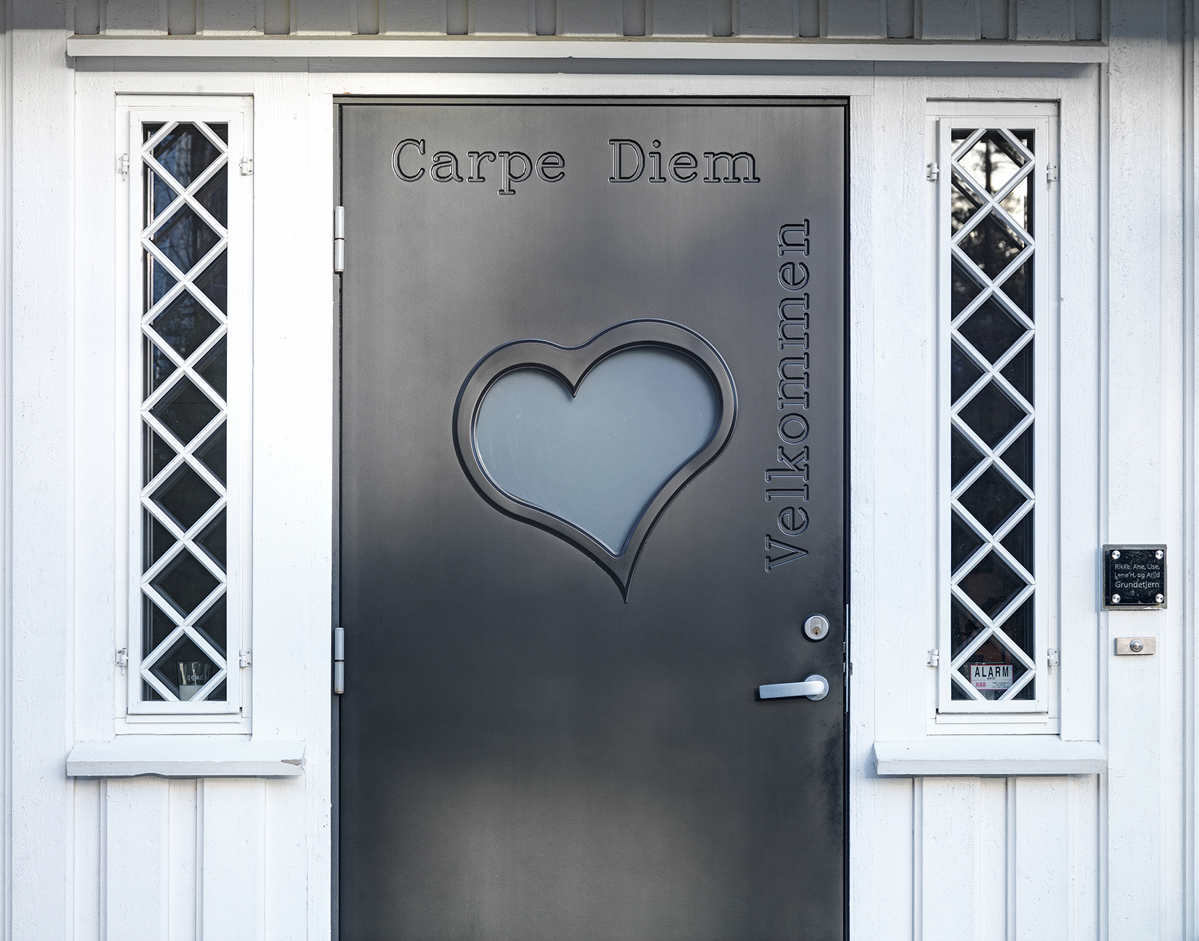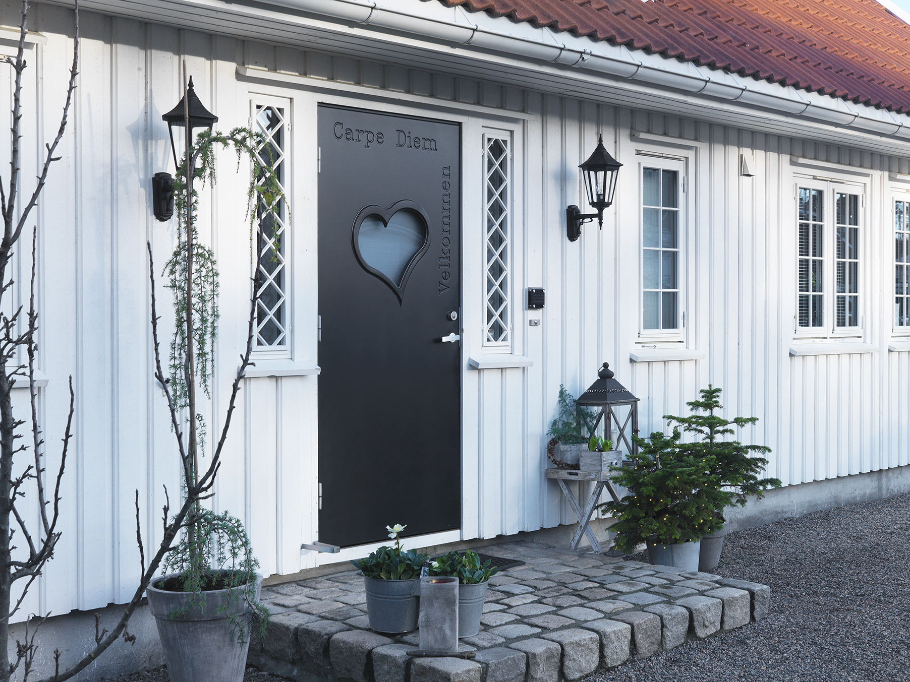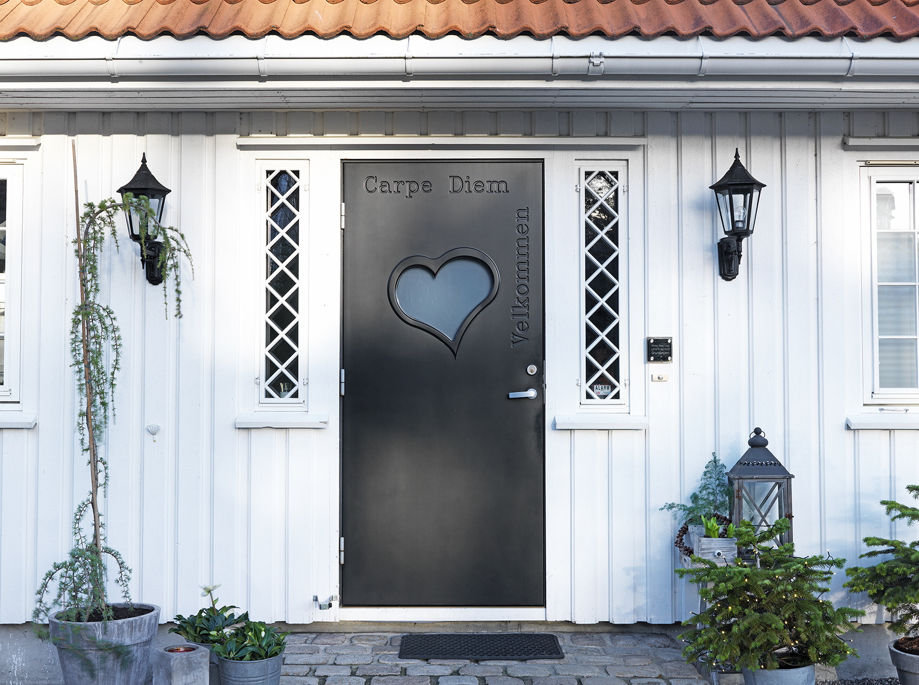 Sørlandshuset har tradisjonsriktige to-rams vinduer med løse sprosser, men som en spennende detalj har de valgt døren Afrodite. Teksten på døren er valgfri, og huseier har valgt "Carpe diem" og "Velkommen". Huset er bygget i 1955. (Bildene er tatt i 2015. Giljevinduene er av eldre dato).