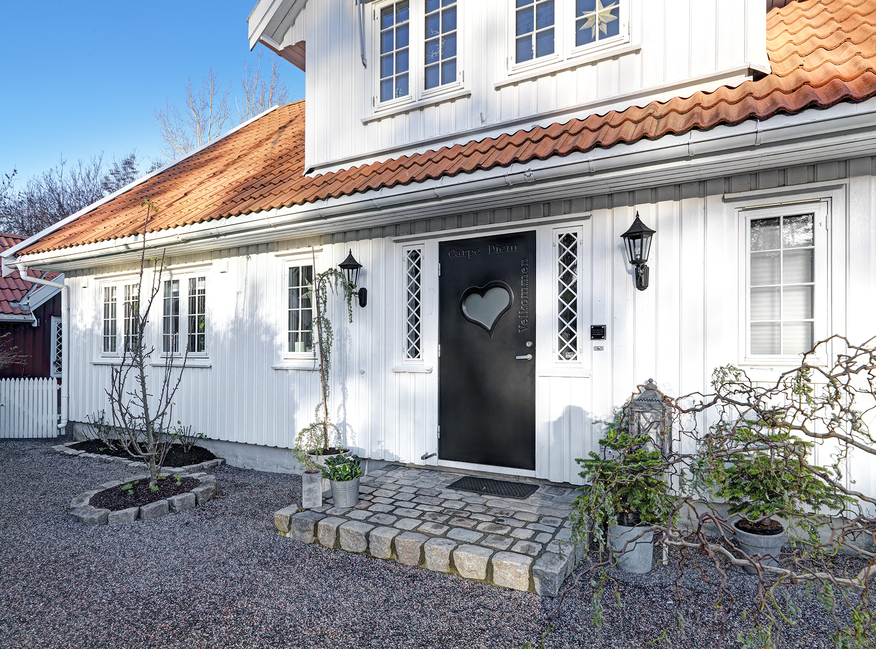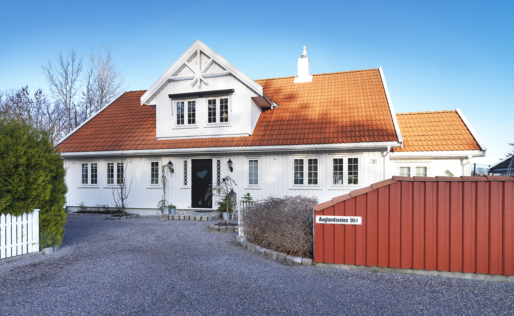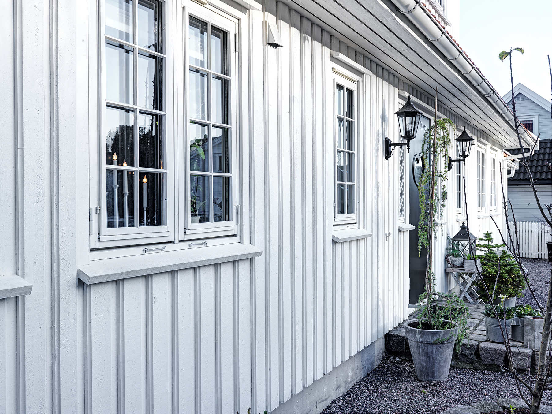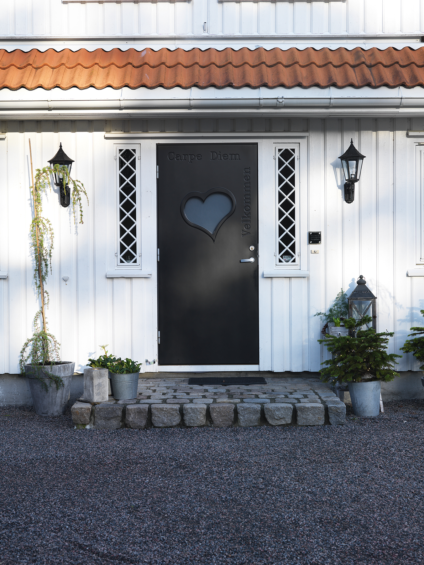 Sørlandshuset har tradisjonsriktige to-rams vinduer med løse sprosser, men som en spennende detalj har de valgt døren Afrodite. Teksten på døren er valgfri, og huseier har valgt "Carpe diem" og "Velkommen". Huset er bygget i 1955. (Bildene er tatt i 2015. Giljevinduene er av eldre dato).