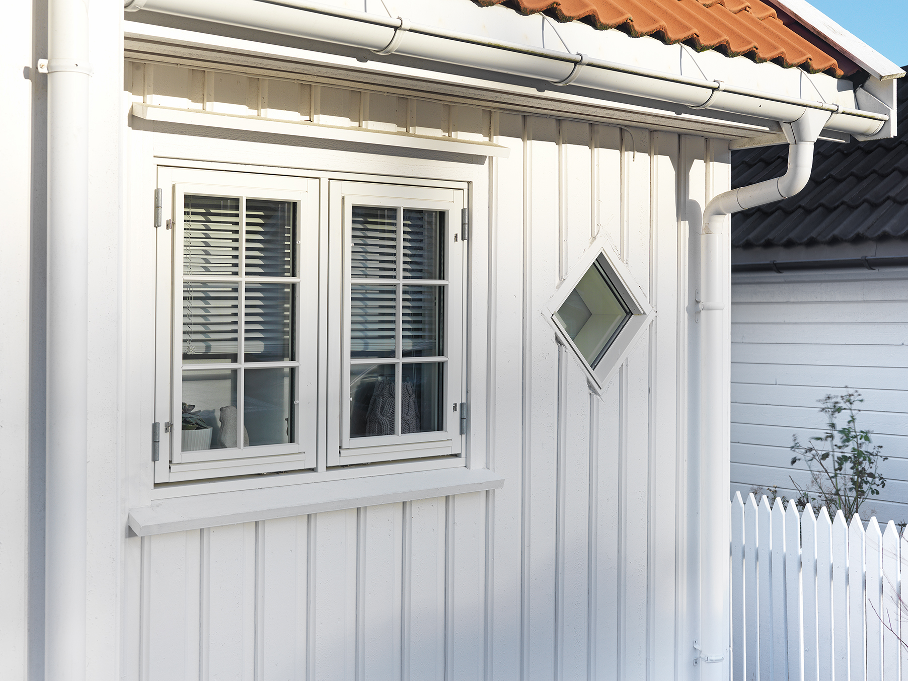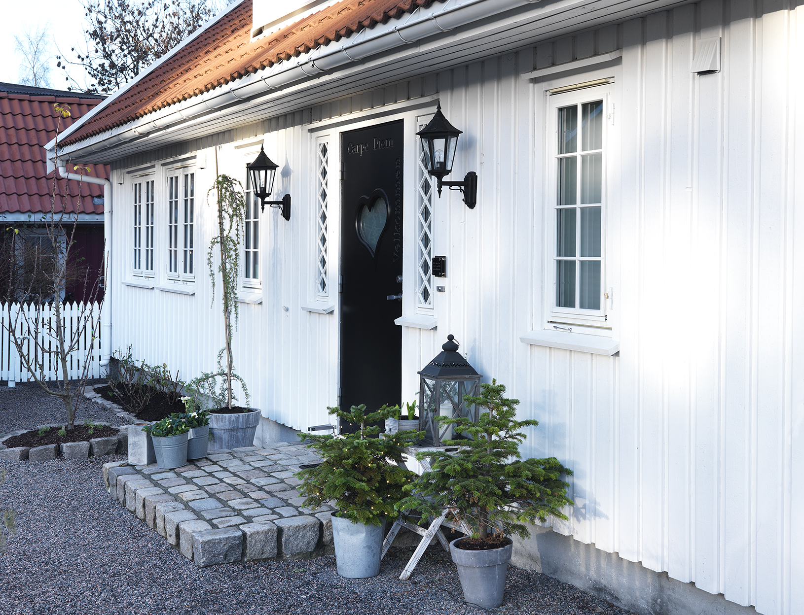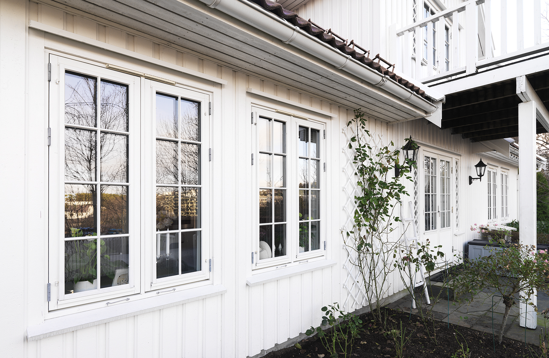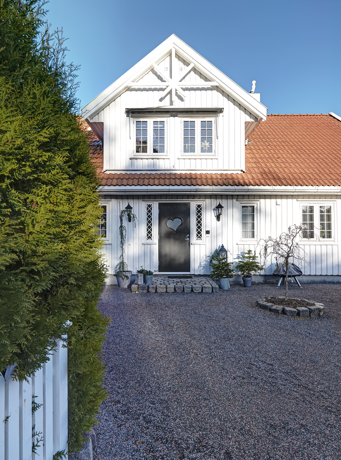 Sørlandshuset har tradisjonsriktige to-rams vinduer med løse sprosser, men som en spennende detalj har de valgt døren Afrodite. Teksten på døren er valgfri, og huseier har valgt "Carpe diem" og "Velkommen". Huset er bygget i 1955. (Bildene er tatt i 2015. Giljevinduene er av eldre dato).