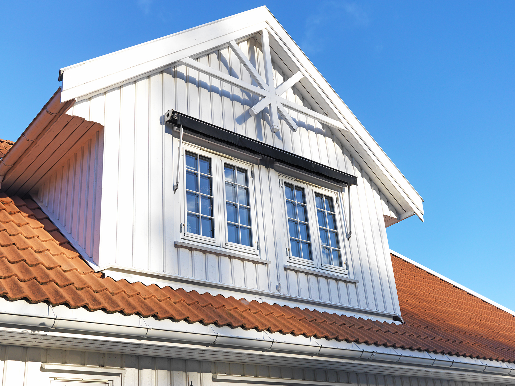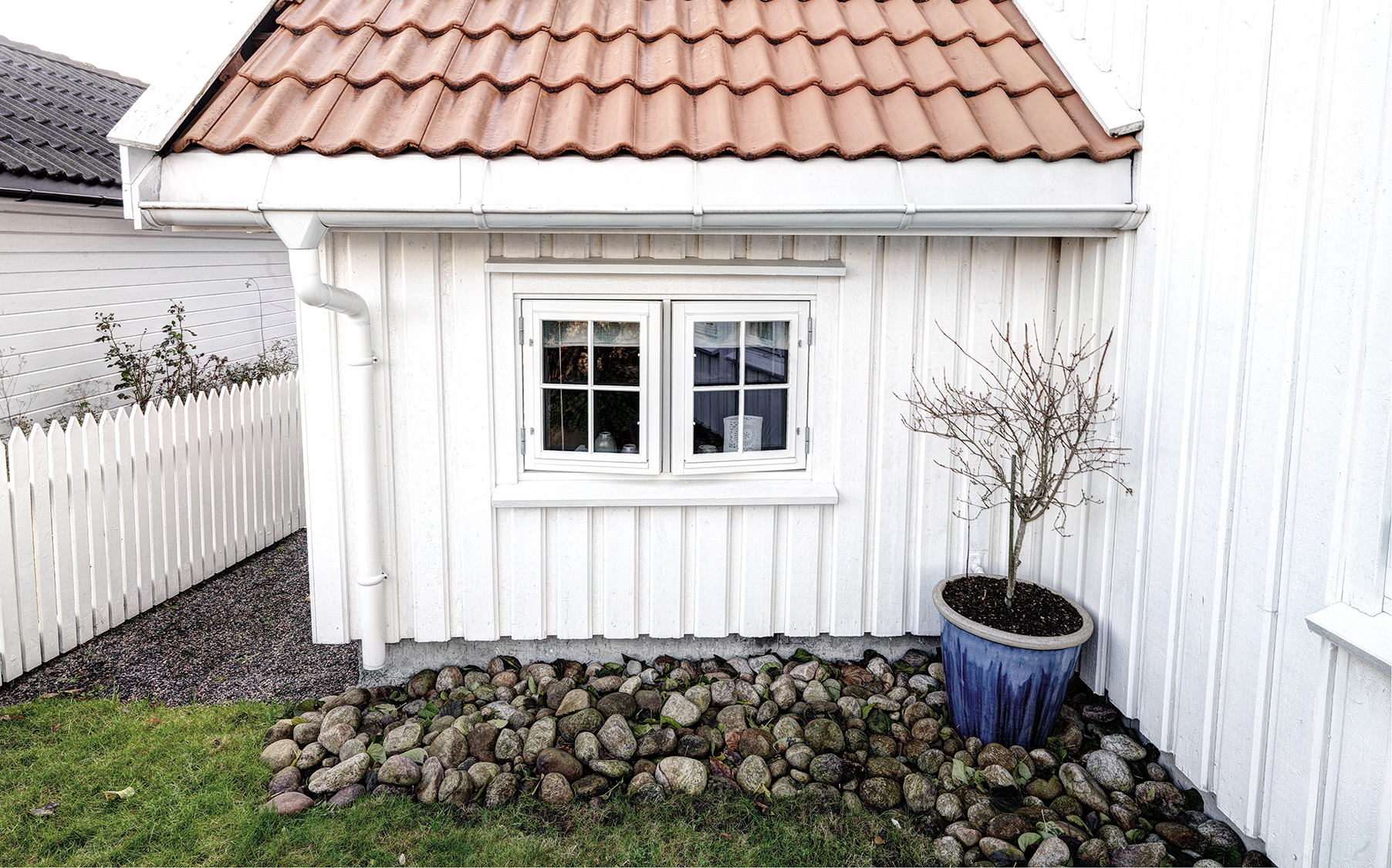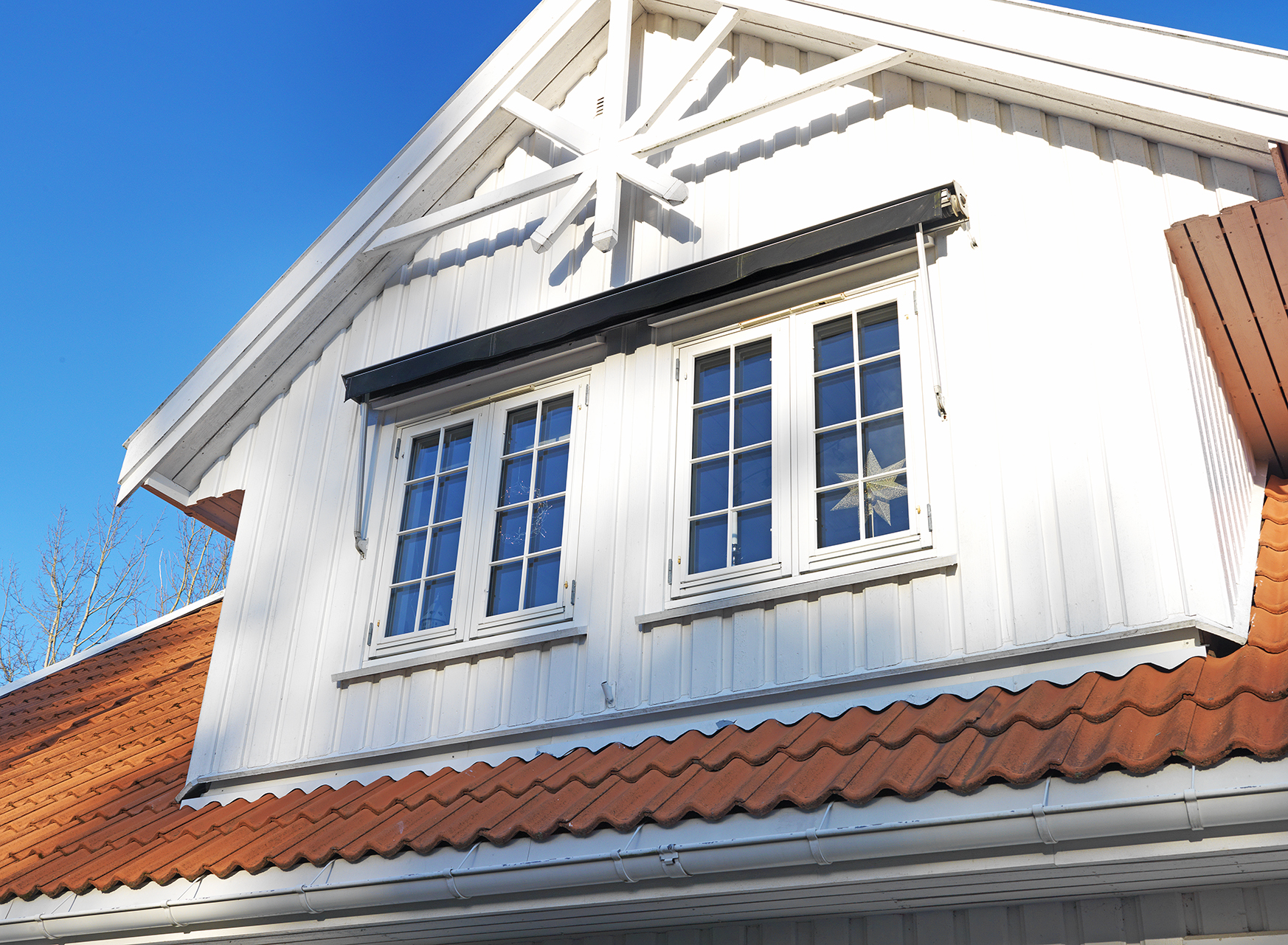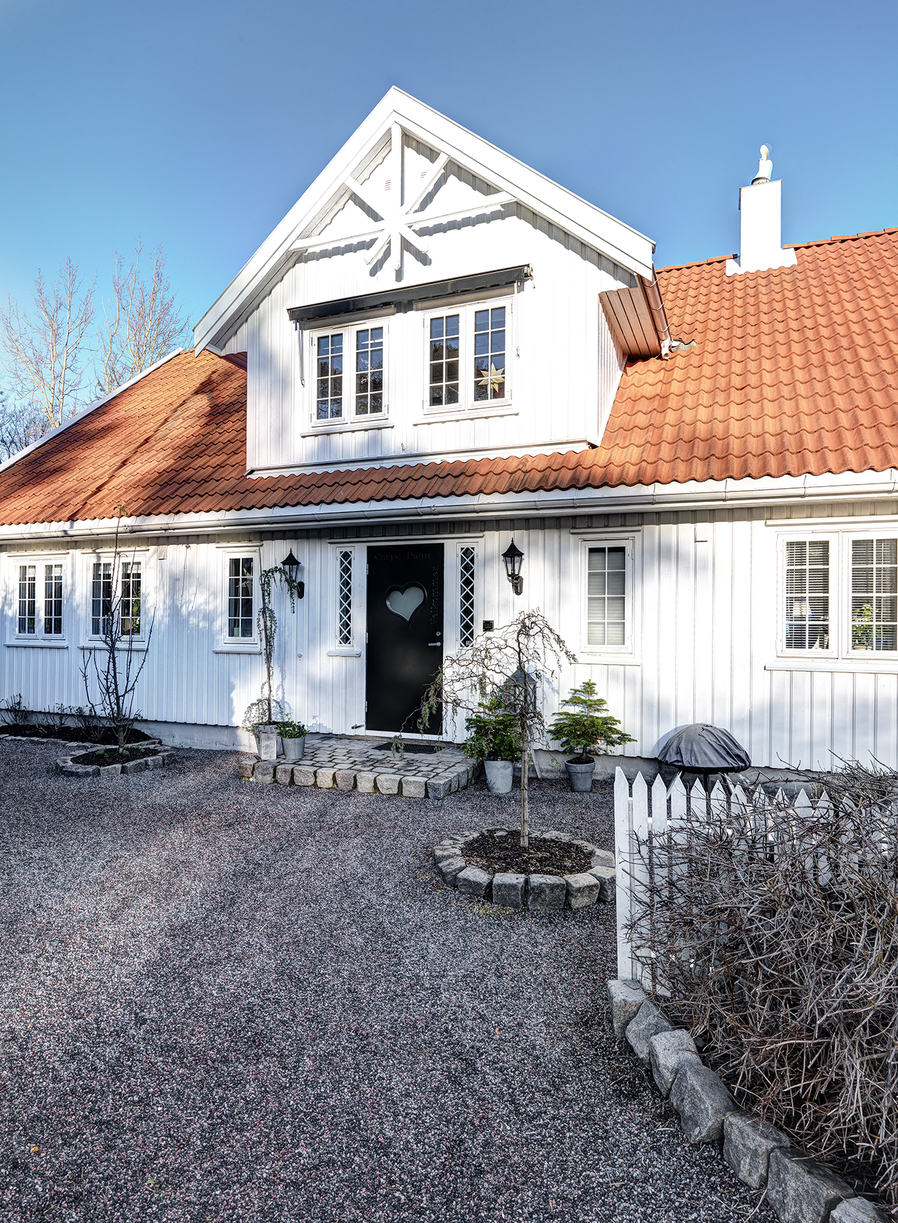 Sørlandshuset har tradisjonsriktige to-rams vinduer med løse sprosser, men som en spennende detalj har de valgt døren Afrodite. Teksten på døren er valgfri, og huseier har valgt "Carpe diem" og "Velkommen". Huset er bygget i 1955. (Bildene er tatt i 2015. Giljevinduene er av eldre dato).