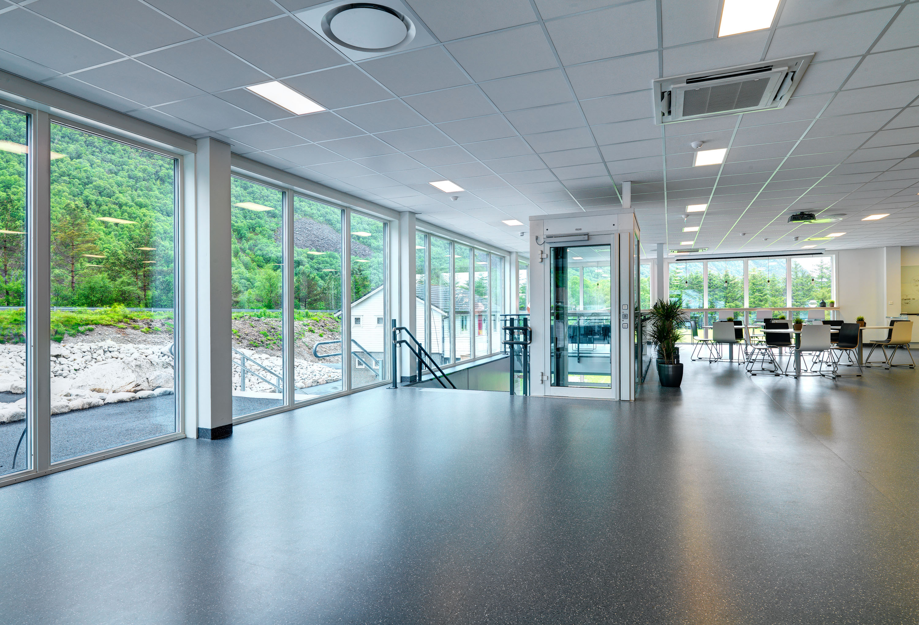 Det er selvrensende glass på utside og sikkerhetsglass på innside. Lystransmisjonen er 70% og G-faktoren 50. Speilrefleksen er mellom 10 og 15%. Alle utvendige vinduer er levert med vedlikeholdsfri aluminiumsbekledning. Innvendig har vi levert vindu med brannkrav EI60 og EI30 for å dele av hall fra resten av bygget.