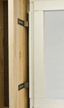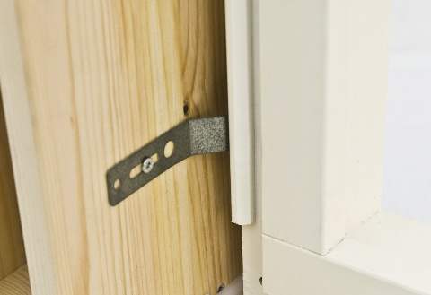 - Når vinduet er riktig plassert kan beslaget festet med skruer i stender. Fest kun i justeringssporet på beslaget inntil vinduet står som det skal.